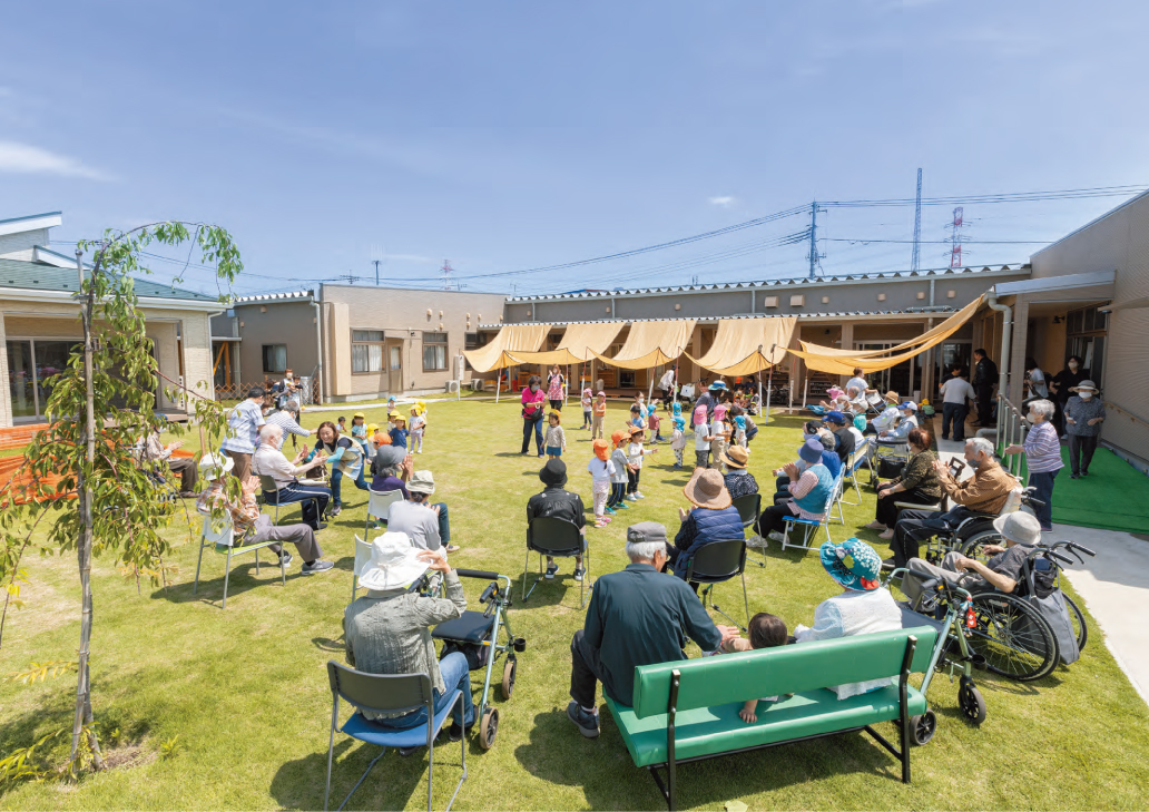 日本でも数少ない介護・保育・発達支援を融合した大規模世代間交流施設を運営しています。赤ちゃんから高齢者まで、障がいの有無を問わず共生し、互いに刺激し合いながら成長できる環境づくりを目指しています。